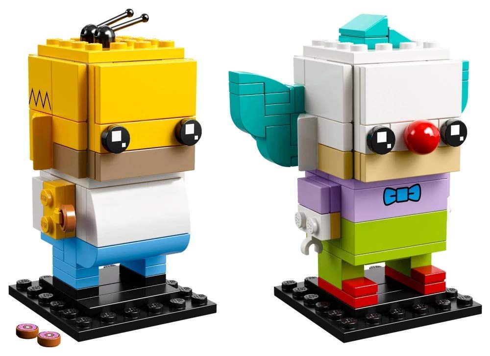 Die baubaren LEGO® BrickHeadz Charaktere Homer Simpson und Krusty der Clown haben bedruckte Augen und die authentischen Details der Figuren aus der Zeichentrickserie The Simpsons: wie Homers Glatze und rosa Lieblings-Donut und Krustys lustiges grünes Haar und seine rote Nase.