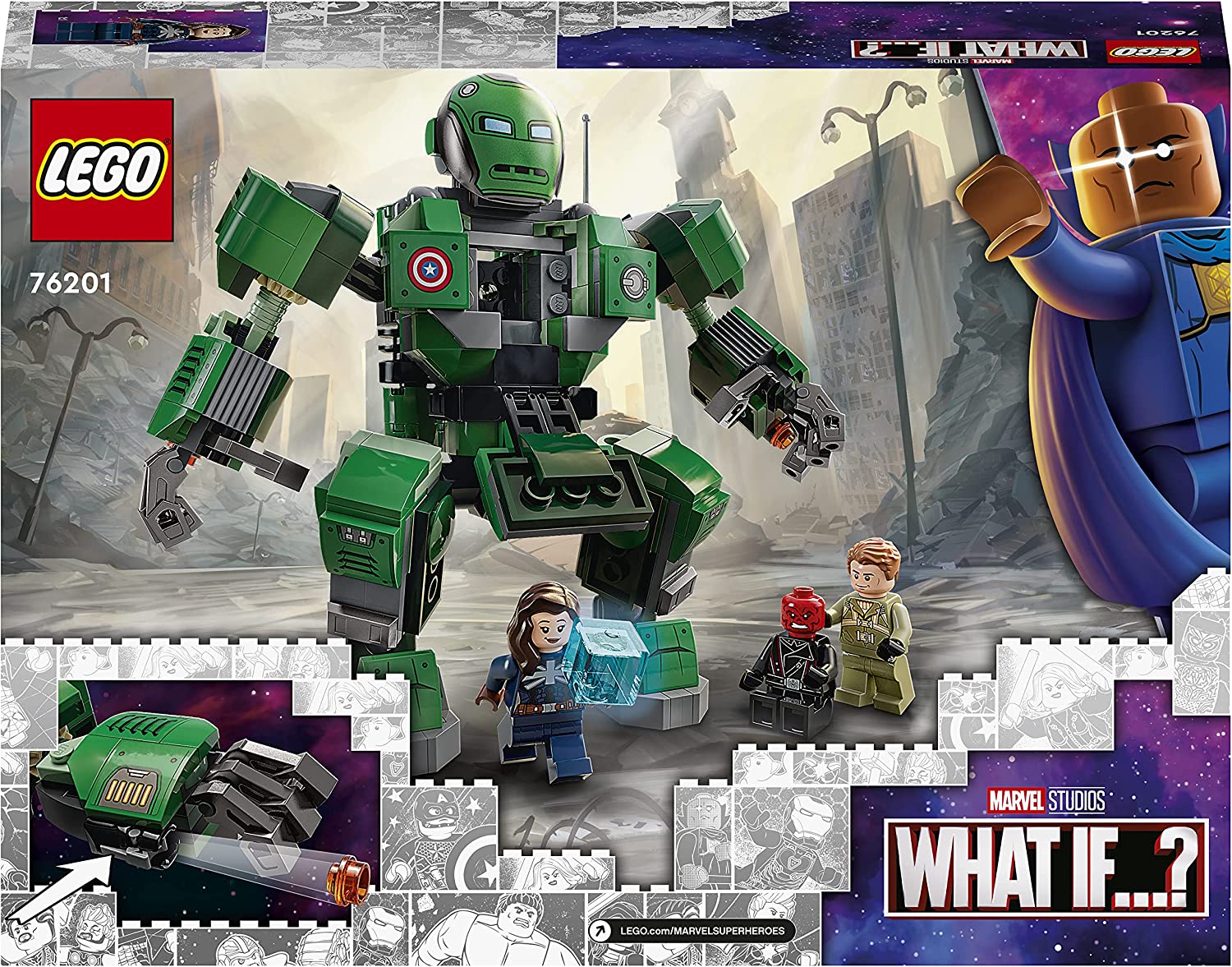 - Beinhaltet die Minifiguren Captain Carter, Steve Rogers und Red Skull sowie einen baubaren Mech mit aufklappbarem Cockpit und 2 Shootern.
