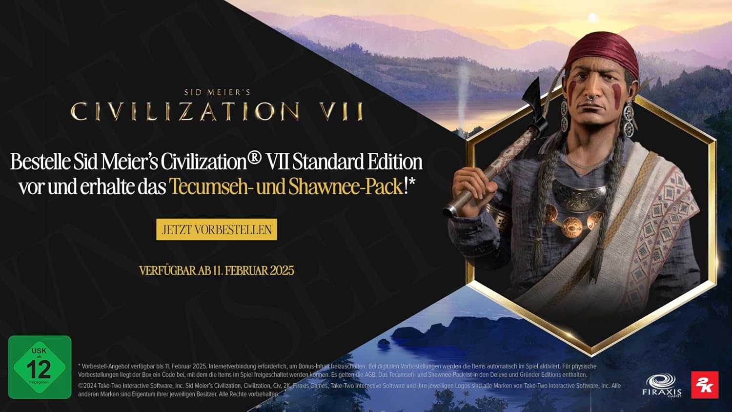- Bestelle Sid Meier's Civilization VII Standard Edition vor und erhalte das Tecumseh- und Shawnee-Pack!* Das Tecumseh- und Shawnee-Pack ist in der Deluxe Edition enthalten. * Das Vorbestell-Angebot ist bis 11. Februar 2025 verfügbar. Internetverbindung erforderlich, um Bonus-Inhalt freizuschalten. Es gelten die AGB.